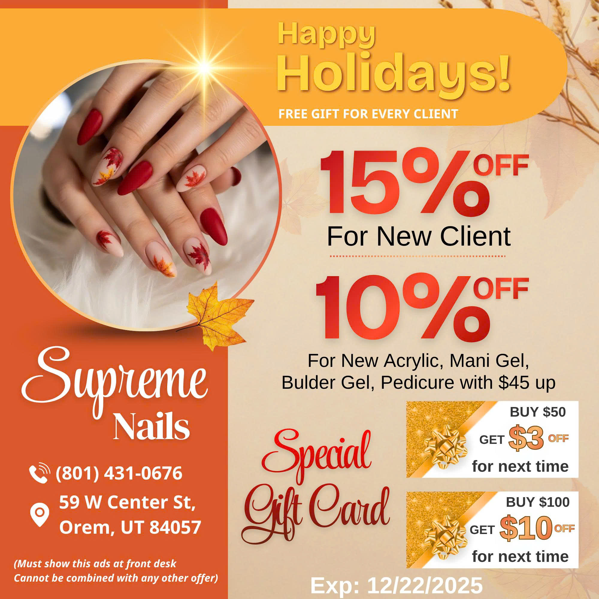 Located conveniently in Orem, UT 84057, our nail salon pleased to provide the clean and welcome atmosphere, which will make you freely enjoy the relax moments and escape from all of life’s pressure to make the most of wonderful time.